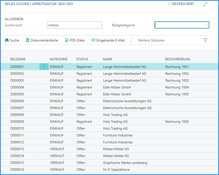 Mit Hilfe der Volltextsuche können alle importierten Dokumente frei durchsucht werden. Die Suche ist dabei nicht auf die bei der Erfassung oder Buchung des Dokuments übertragenen Informationen beschränkt. Sie können das Dokument über die Funktion “Zeige Dokumenten Karte” und die PDF-Datei mit “Datei zeigen” einsehen. Document Capture durchsucht bei einer Volltextsuche alle im Dokument enthaltenen Texte und Zeichen.
