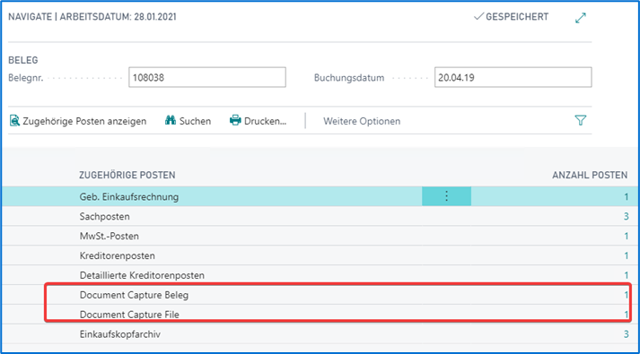 Document Capture archiviert alle importierten Belege. Sie haben verschiedene Möglichkeiten, diese zu finden, auch nachdem diese erfasst oder gebucht wurden. Sie können Belege zu gebuchten Einkaufsrechnungen beispielsweise über die Funktion Navigate im Menüband der Seite finden.